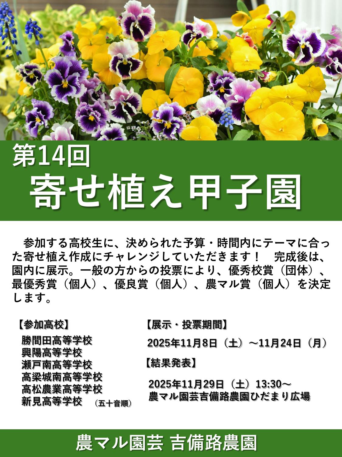 『農マル園芸寄せ植えコンテスト』の一環として、県内の農業高校など6校の生徒87名が参加する、 『第14回寄せ植え甲子園』が開催されます!