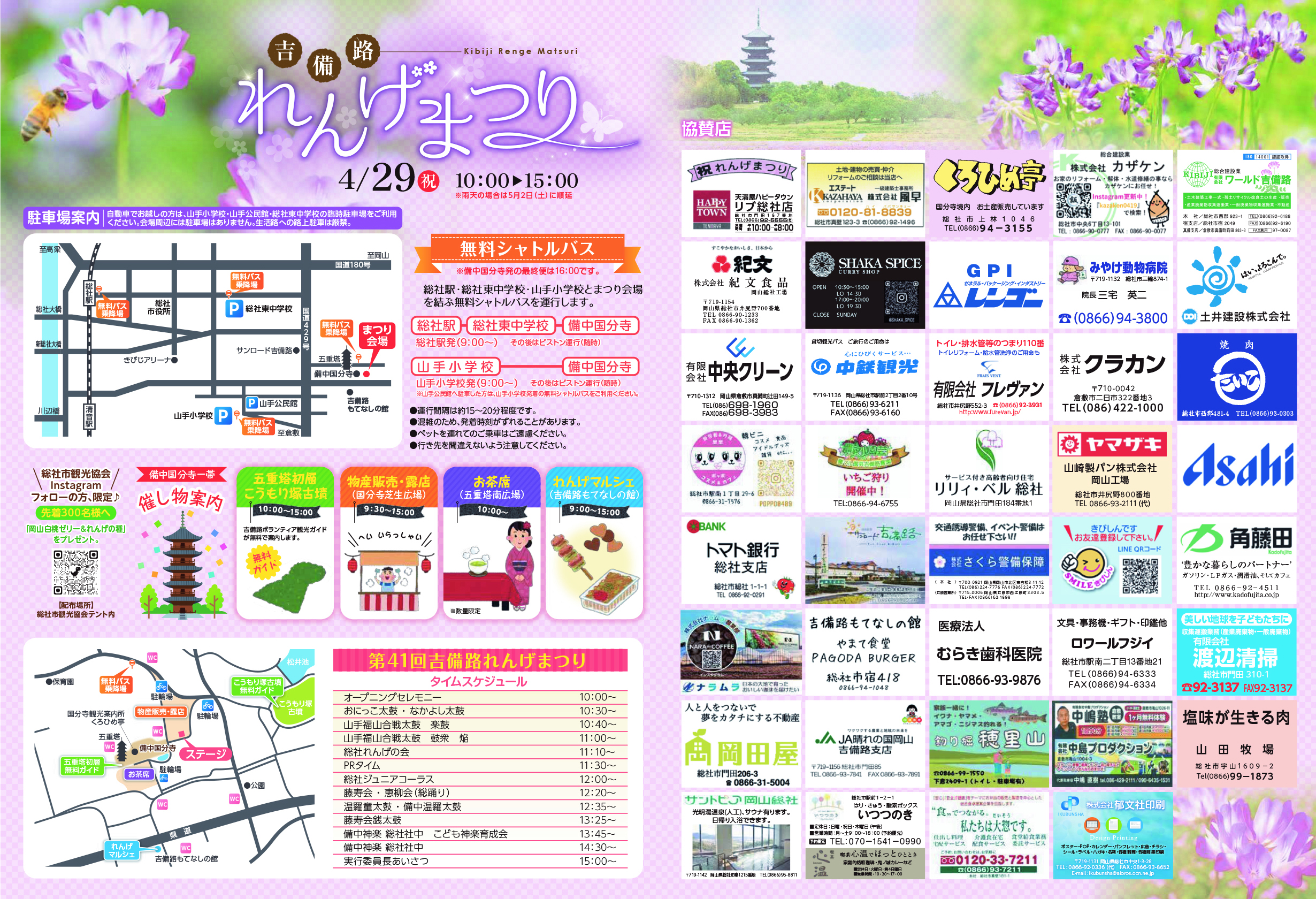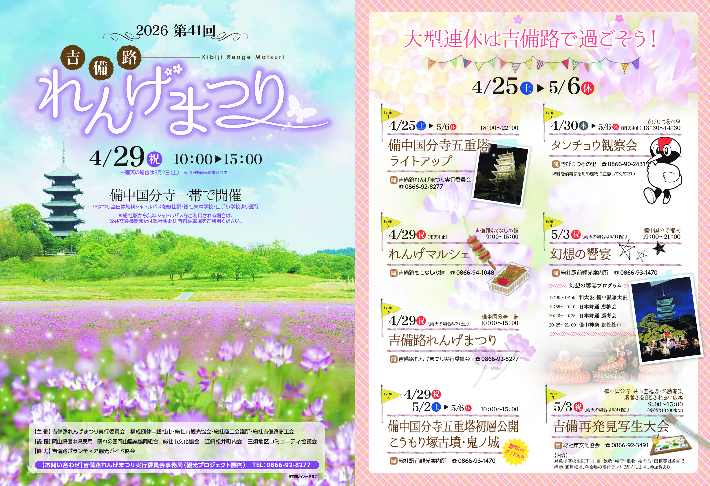 備中国分寺周辺の畑一面にレンゲの花が咲き誇る季節、五重塔初層やこうもり塚古墳の無料ガイドや露店に物販販売、お茶席やれんげマルシェなど、見どころ満載のイベントが開催されます! 【タイムスケジュール】 【お問い合わせ】 |